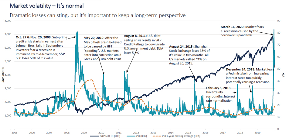 As we begin the third quarter, there is no way of predicting how the markets will react, and whether monetary and fiscal support will outweigh future outbreaks of COVID-19 and any subsequent economic disruptions. What we do know is that volatility remains a distinct possibility, and that history shows continuing to stick to a well-constructed, long-term plan has been the right move. The chart below illustrates this point nicely.